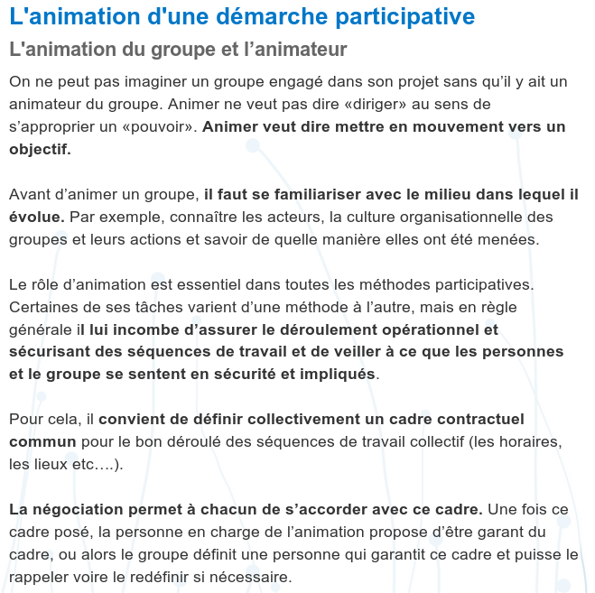 visitez l'article complet ici : https://fiches.manager-go.com/fiches-pratiques/2-animer-une-reunion.html L'animateur est là pour animer. .client basé à segré recrute un animateur / animatrice dans le cadre d'un. Notre rôle en est un d'animateur et de coordonnateur pour le compte des 202 premières nations, ainsi . les groupes musicaux seront pilotés par l'animateur, qui pourra aussi apporter des documents sur la culture du pays d'origine des différents .